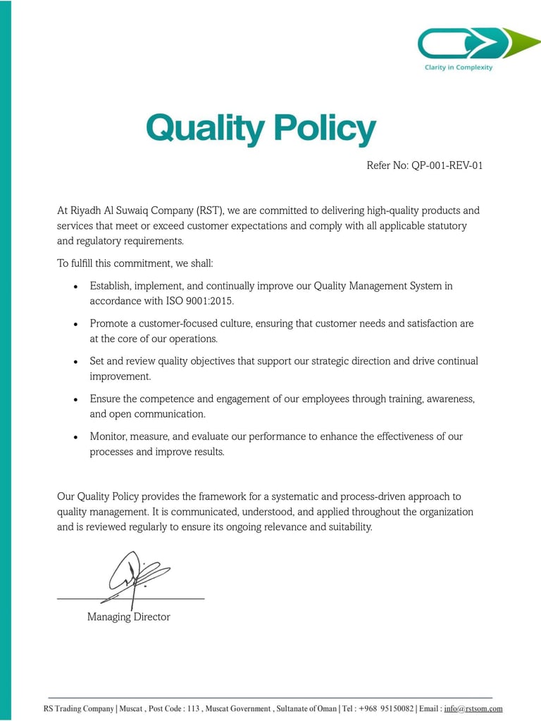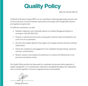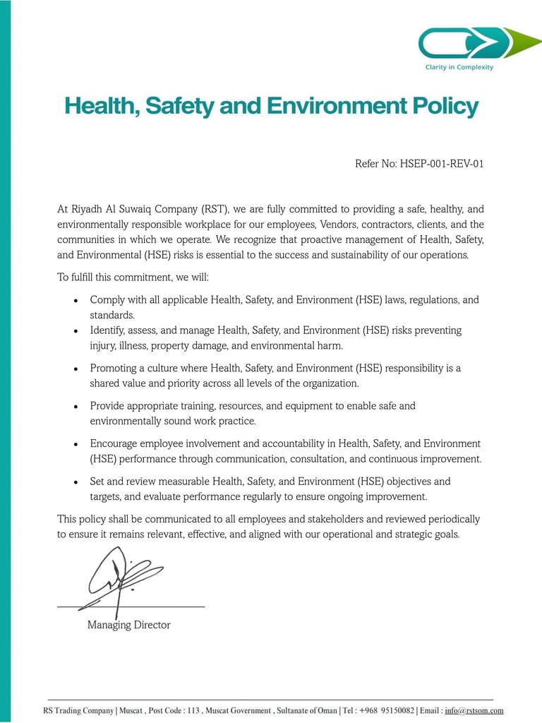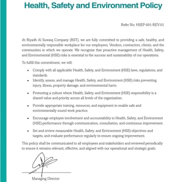 نلتزم بالنزاهة والجودة والممارسات التجارية الأخلاقية في جميع عملياتنا. ونولي أهمية قصوى لمعايير الصحة والسلامة والبيئة لحماية الأفراد وكوكب الأرض. ويدفعنا التحسين المستمر ورضا العملاء إلى تحقيق أهدافنا وتحسين أدائنا